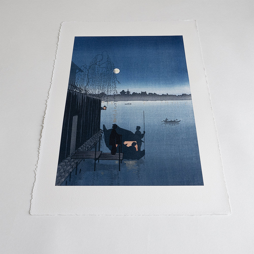Popis: Tisk zobrazuje poetickou noční scénu s ženou očekávající loďku s poutníky.