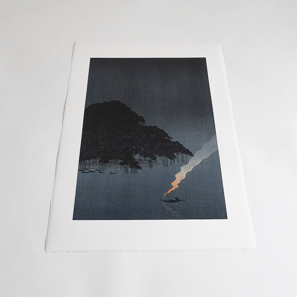 Popis: Tisk zobrazuje poetickou noční scénu s rybářskou loďkou, plující po jezeře Biwa k borovicovému háji u Karasaki.