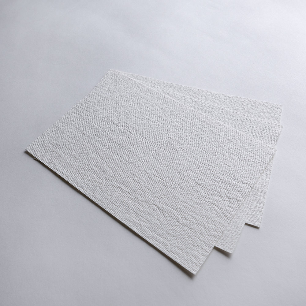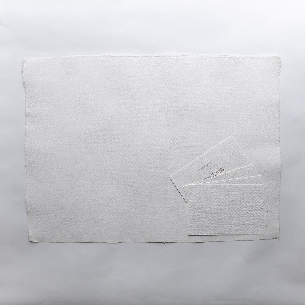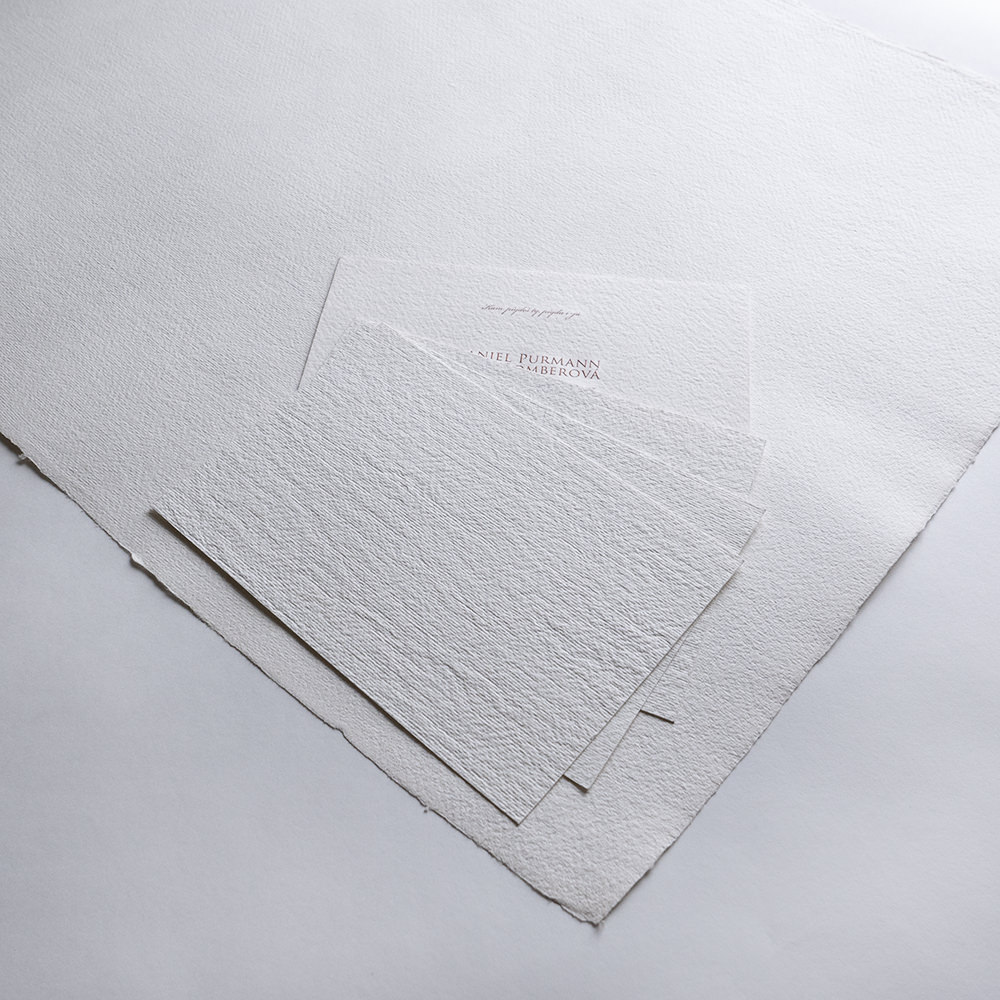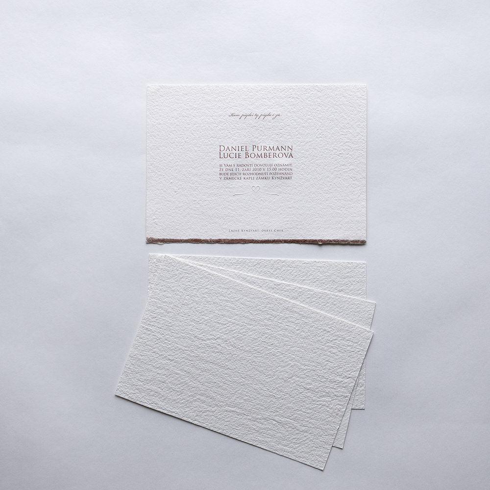 Použití: jedná se o II.Q archů, které byly původně používány pro reprodukce olejomaleb ze sbírek Národní galerie v Praze. Kvůli drobným nečistotám, nesouměrným stranám nebo drobným poškozením byly tyto archy vyřazeny ze série určené pro reprodukce. Stále se jedná o nádherné papíry, které mají unikátní texturu připomínající malířské plátno. Z jednoho archu je možné nařezat 10 karet formátu A5 pro následný inkoustový tisk nebo knihtisk, slepotisk a fólioražbu. Na ukázce je svatební oznámení tištěné hlubotiskem.